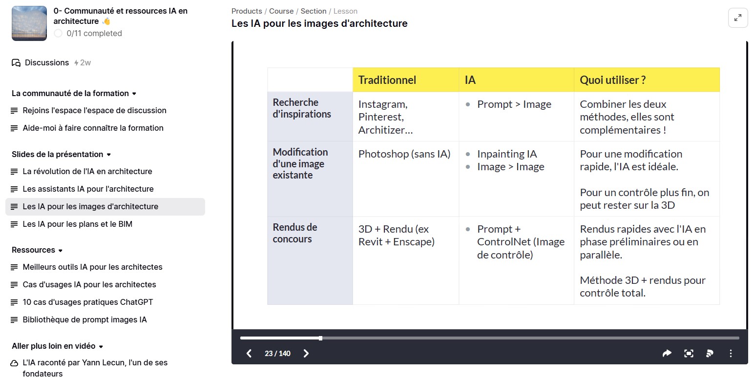 Je développe des formations en ligne sur l'IA en architecture pour aider les professionnels de l'architecture à utiliser l'IA en pratique afin de gagner du temps et concevoir de meilleurs projets.